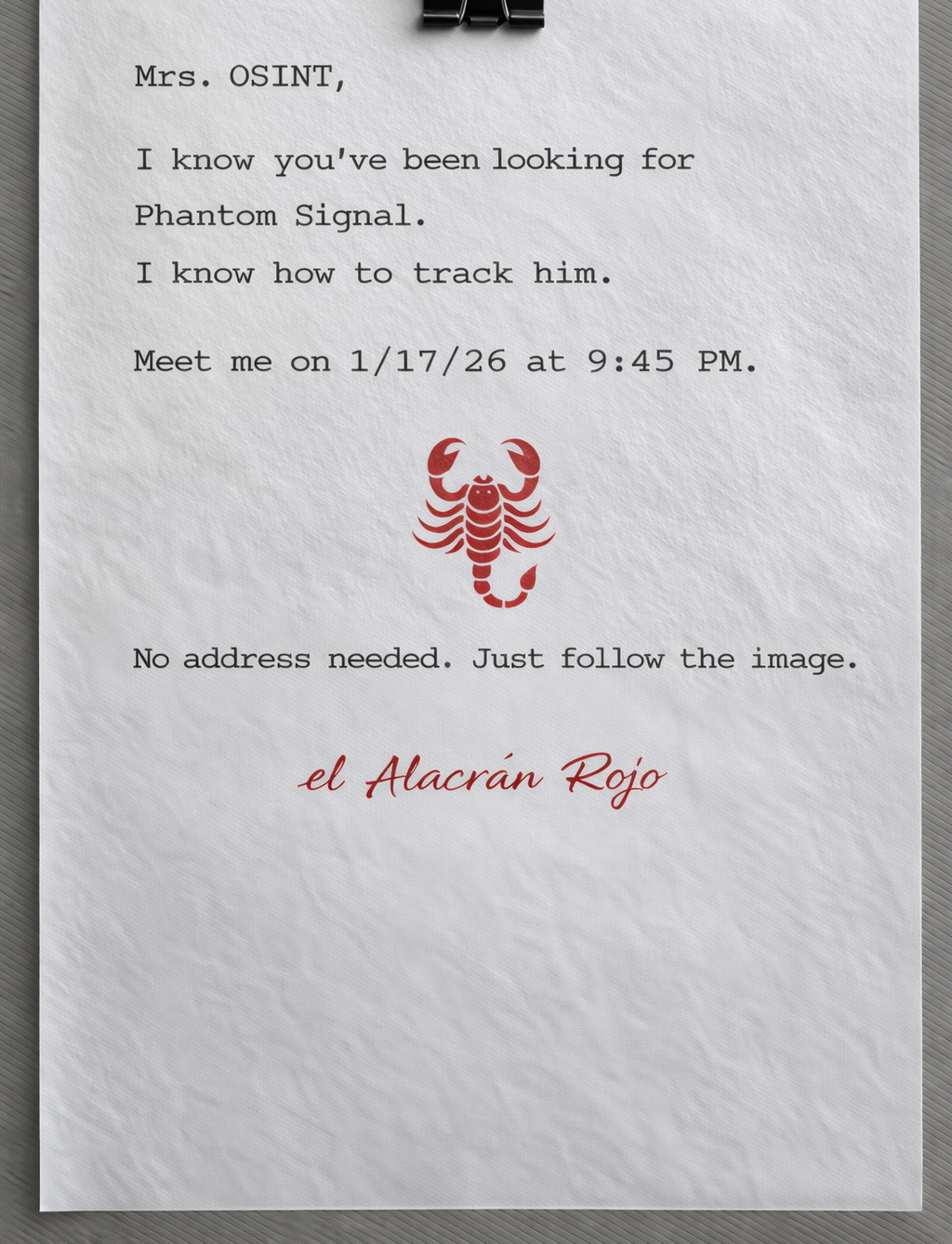 This is a scenario-based OSINT challenge. The characters are fictional, but the location in the image is real.